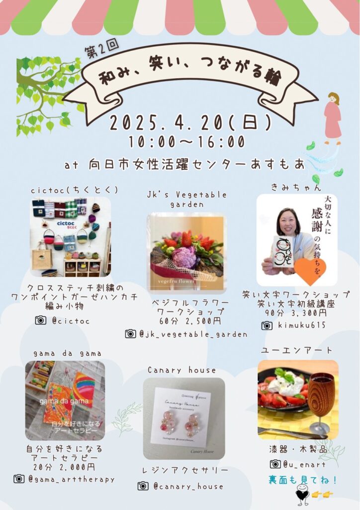 GALLERY 2025.4.20 マルシェ「第2回 和み、笑い、つながる輪」参加(@向日市女性活躍センターあすもあ) 4/20に地元向日市で開催されたマルシェ「「第2回 和み、笑い、つながる輪」に参加しました。 ご来場の方や同じく出店者の方と楽しく1日過ごしました! そしてご来場くださったみなさま、漆器・木製品をお迎えくださった皆様、ありがとうございました。 2025.3.20 MUKOスマイルフェス 参加(@Second Rooms) 前の記事 2025.5.20 FMおとくに「さわやかおとくに」出演 次の記事